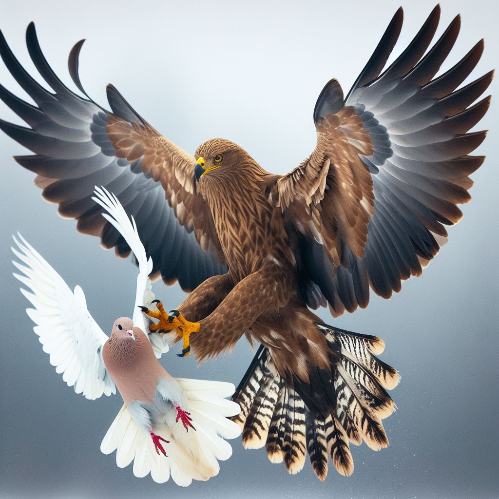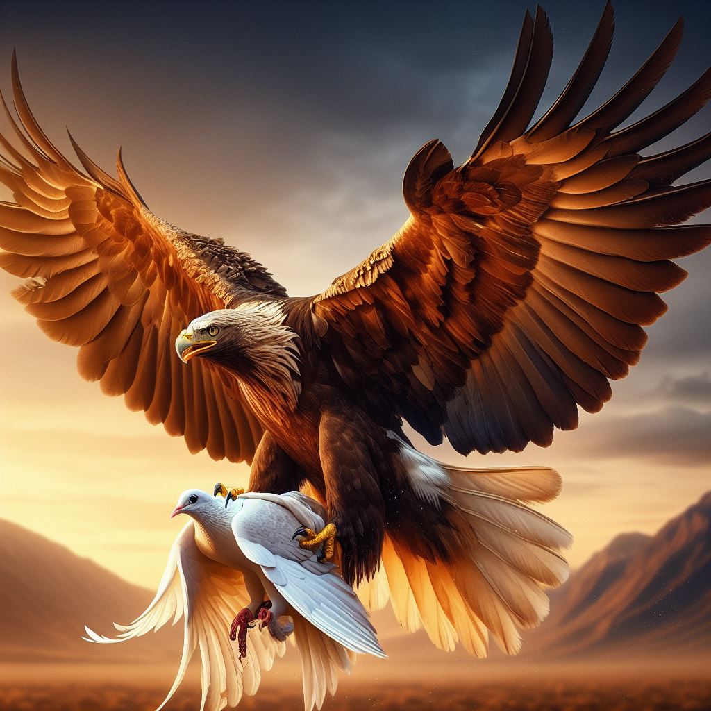 Cuando la hembra llega a las aceitillas, el águila aparece de nuevo, había estado vigilándolos desde lo alto y aprovechó su agudeza visual para calcular el mejor momento para atacar. El macho se da cuenta que va por ella y le alerta, por lo que ella se apresura a regresar a la seguridad del arbusto, pero a medio vuelo… el águila la toma con sus patas, las garras atraviesan a la huilota que no pudo volar lo suficientemente rápido, una garra le penetra el costado derecho y la atraviesa por en medio de su cuerpo hasta salir por debajo de su ala izquierda. El macho huilota ve con desesperación como el águila se lleva a su amada, ella va viva aunque mal herida, no hay esperanza, él no puede volar, ella no puede escapar del agarre mortal del depredador.